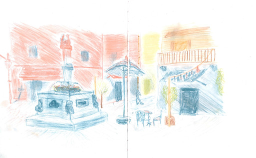 Täglich setzten wir uns vor spannende Gebäude und Sujets, welche wir mit unterschiedlichen Zeichentechniken wie Wasserfarbe, Farbstifte, Bleistifte oder Tusch skizzieren konnten. Die Tage gestalteten sich sehr abwechslungsreich, da wir zwischen den Zeichnungseinheiten immer wieder Führungen durch spannende Einrichtungen hatten.